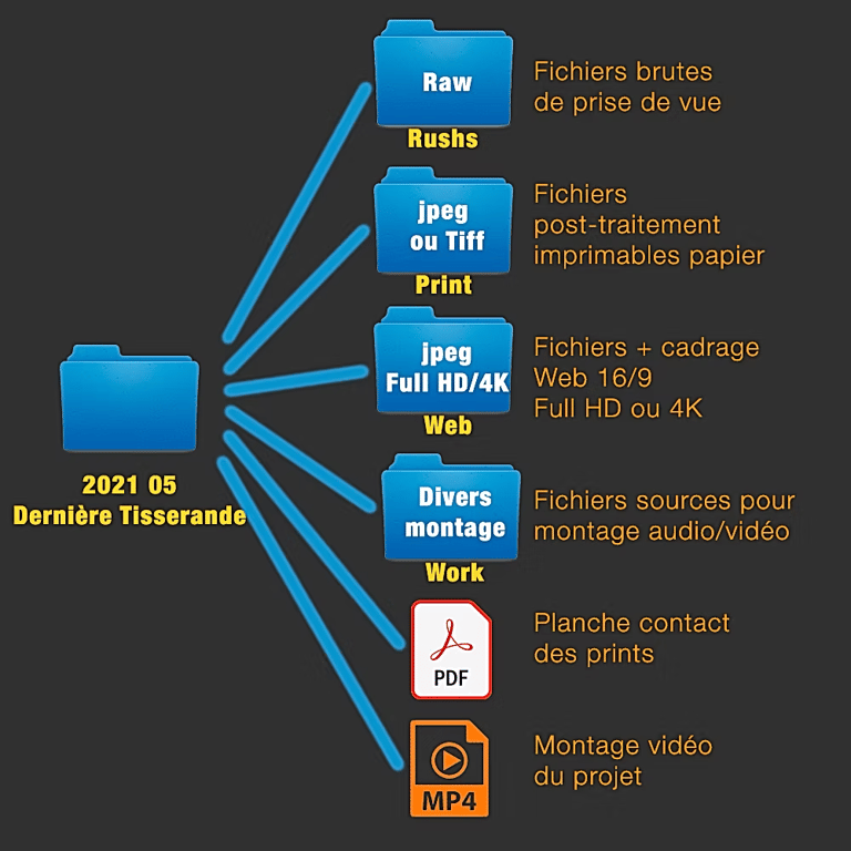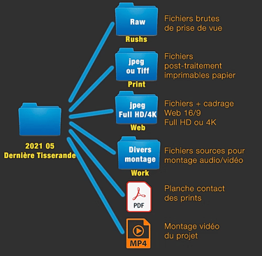 Archiver ses photos sur plusieurs supports. (Disque dur SSD ou/et Cloud). Personnellement j'utilise les deux en externe à mon ordinateur, pour libérer de l'espace de travail et protéger ma production. Des solutions Cloud + fibre haut débit permettent aujourd'hui de travailler en direct sur ses fichiers distants, même pour des fichiers lourds comme de la vidéo. Ils offrent aussi la possibilité de partager dans une configuration de travail collaboratif, avec par exemple un indexage à l'image prêt sur une vidéo pour y noter des remarques ou proposer une modification en télétravail. Idéalement cela rend possible l'archivage des fichiers bruts (.Raw ou .mp4 par exemple) . Une planche contact numérique ou de diaporama en partage + un fichier .mp4 s'il y a eu la production d'une vidéo. je résume ci-dessous : Un petit dessin vaut mieux qu'un ... Bref, a chacun sa méthode d'archivage, t'en que ça fait le travail. C'est bien d'y penser avant d'en avoir vraiment besoin. Après qq projets sérieux et commandes de plusieurs d'heures, ça tranquillise bien.