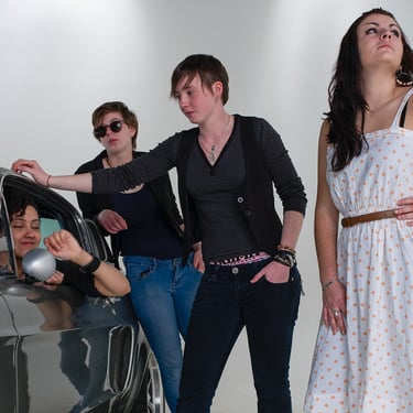 Faire rentrer dans le studio la voiture en marche arrière dans la diagonale du studio. Nettoyer si possible les traces de pneus. Chercher le cadre et la focale. Déboucher les latéraux et petits travaux sur les effets de profondeur lumière. Préparer la composition lumière sur l'espace de figuration.